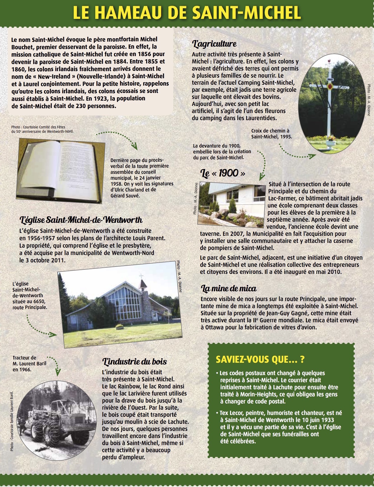 C’est en 1856 que la mission catholique de Saint-Michel, qui deviendra la paroisse de Saint-Michel en 1884, a été fondée, première pierre de ce qui allait devenir le hameau Saint-Michel de Wentworth-Nord.